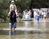 Television footage showed a man wearing a helmet, apparently a construction worker, holding onto a stone bridge column in a desperate effort not to be swept away by the flash flooding.