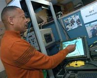 Integration engineer Willie Jackson illustrates how the Blue Force Tracker can identify and locate units anywhere in the world. There are three types of maps available; topographical, detailed and satelite image. ( U.S. Air Force photo/Sue Sapp)