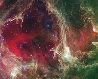 Pasadena CA (SPX) Aug 25, 2008 A new image from NASA's Spitzer Space Telescope tells a tale of life and death amidst a rich family history. The striking infrared picture shows a colorful cosmic cloud, called W5, studded with multiple generations of blazing stars. It also provides dramatic new evidence that massive stars -- through their brute winds and radiation -- can trigger the birth of stellar newborns. "Triggered star formation continues to be very hard to prove," said Xavier Koenig of the Harvard Smithsonian Center for Astrophysics in Cambridge, Mass. "But our preliminary analysis shows that the phenomenon can explain the multiple generations of stars seen in the W5 region." Koenig is lead author of a paper about the findings in the December 1, 2008, issue of the Astrophysical Journal. The most massive stars in the universe form out of thick clouds of gas and dust. The stars are so massive, ranging from 15 to about 60 times the mass of our sun, that some of their material slides off in the form of winds. The scorching-hot stars also blaze with intense radiation. Over time, both the wind and radiation blast away surrounding cloud material, carving out expanding cavities. Astronomers have long suspected that the carving of these cavities causes gas to compress into successive generations of new stars. As the cavities grow, it is believed that more and more stars arise along the cavities' expanding rims. The result is a radial "family tree" of stars, with the oldest in the middle of the cavity, and younger and younger stars farther out. Evidence for this theory can be seen easily in pictures of many star-forming regions, such as W5, Orion and Carina. For example, in the new Spitzer picture of W5, the most massive stars (some of the blue dots) are at the center of two hollow cavities, and younger stars (pink or white) are embedded in the elephant-trunk-like pillars as well as beyond the cavity rim. However, it is possible that the younger stars just happen to be near the edge of the cavities and were not triggered by the massive stars. Koenig and his colleagues set out to test the triggered star-formation theory by studying the ages of the stars in the W5 region. They used Spitzer's infrared vision to peer through the dusty clouds and get a better look at the stars' various stages of evolution. They found that stars within the W5 cavities are older than stars at the rims, and even older than stars farther out past the rim. This ladder-like separation of ages provides some of the best evidence yet that massive stars do, in fact, give rise to younger generations. "Our first look at this region suggests we are looking at one or two generations of stars that were triggered by the massive stars," said co-author Lori Allen of the Harvard-Smithsonian Center for Astrophysics. "We plan to follow up with even more detailed measurements of the stars' ages to see if there is a distinct time gap between the stars just inside and outside the rim." Millions of years from now, the massive stars in W5 will die in tremendous explosions. When they do, they will destroy some of the young nearby stars -- the same stars they might have triggered into being. W5 spans an area of sky equivalent to four full moons and is about 6,500 light-years away in the constellation Cassiopeia. The Spitzer picture was taken over a period of 24 hours. The color red shows heated dust that pervades the region's cavities. Green highlights the dense clouds, and white knotty areas are where the youngest of stars are forming. The blue dots are older stars in the star-forming cloud, as well as unrelated stars behind and in front of the cloud. Other authors include Robert Gutermuth, now at Smith College in Northampton, Mass.; Chris Brunt of the University of Exeter, England; James Muzerolle of the University of Arizona, Tucson; and Joseph Hora of Harvard-Smithsonian Center for Astrophysics. NASA's Jet Propulsion Laboratory, Pasadena, Calif., manages the Spitzer mission for NASA's Science Mission Directorate, Washington. Science operations are conducted at the Spitzer Science Center at the California Institute of Technology, also in Pasadena. Caltech manages JPL for NASA. Related Links Spitzer Space Telescope Stellar Chemistry, The Universe And All Within It
