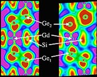 Spin density contour plots for Gd5Si2Ge2 show dramatic changes when Ge2 covalent bonds break at the magnetostructural transition responsible for the giant magnetocaloric effect in this material. (Calculations by Y. Lee and B. Harmon.)