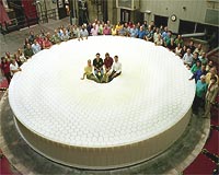 Members of the team building the LSST, a large survey telescope being built in Northern Chile, gather to celebrate the successful casting of the telescope's 27.5-foot-diameter mirror blank. The LSST, or Large Synoptic Survey Telescope, requires three large mirrors to give crisp images over a record large field of view. The two largest of these mirrors are concentric and fit neatly onto the large mirror blank shown here. Seated on the mirror (L-R): LSST Director Tony Tyson, LSST System Scientist Zeljko Ivezic, LSST System Engineer Chuck Claver, LSST Project Manager Don Sweeney. Image credit: Howard Lester / LSST Corporation.
