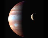 This montage of giant Jupiter and its volcanic moon Io, replete with the spectacular Tvashtar polar plume, was assembled from New Horizons imagery.