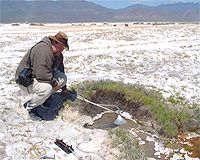 Arizona State geochemist Matthijs van Soest samples surface water in the northern Basin and Range. The sample is collected without direct exposure to air and stored in the copper tube, foreground left, which will be sealed by crimping. Berkeley photo.