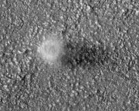 This image covers an impact crater roughly 4 kilometers (2.5 miles) in diameter. The subimage shows just a small segment of the crater rim (1336 x 889; 3 MB). The surface outside the crater (top) is relatively dark, while the interior wall of the crater has a lighter tone. A few dark patches on the crater wall have small dunes or ripples on their surfaces, and are likely pits filled with dark sand.