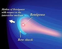 Splashes in the interstellar medium Akari observations of Betelgeuse, a bright red supergiant star located in the constellation Orion about 200 light-years from Earth, show the star making a big splash by creating a bow shock as it crosses the interstellar medium. Researchers have found a strong flow of the interstellar medium around the star which originates from star-forming regions in Orion's Belt. Stars condense out of the interstellar medium at birth, and old stars like Betelgeuse spew out matter into surrounding space, enriching the interstellar medium. This process is repeated by generations of stars and assists the chemical evolution of the Universe. Akari has found a number of such bow shocks and investigation into these processes will further our understanding of the cosmic recycling of matter.