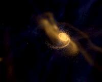 This image from a supercomputer simulation shows the density of dark matter in our Milky Way galaxy which is known to contain an ancient thin disk of stars. Brightness (blue-to-violet-to-red-to-yellow) corresponds to increasing concentration of dark matter. The bright central region corresponds roughly to the Milky Way's luminous matter of gas and stars and the bright clumps indicate dark-matter satellites orbiting our Milky Way galaxy, which are known as "substructure". The simulation predicts that the dark-matter halos of spiral galaxies are lumpy, filled with hundreds of dark matter substructures that pass through the stellar disks of galaxies, leaving their imprint and disturbing them in the process. Credit: Stelios Kazantzidis, Ohio State University