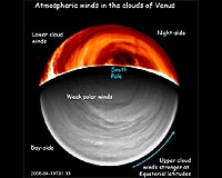 Paris, France (ESA) Sep 19, 2008 It is well known that winds on Venus are extremely fast and powerful. Now, ESA's Venus Express has, for the first time, put together a 3-D picture of the venusian winds for an entire planetary hemisphere. The most powerful atmospheric investigator ever sent to Venus, Venus Express has an advantageous orbit around the planet and a unique set of instruments. The spacecraft has the ability to peer through Venus's thick atmospheric layers and obtain a truly global picture. The spacecraft has continuously monitored the planet since observations began in 2006, and scientists now have enough data to start building a complete picture of the planet's atmospheric phenomena. The Venus Express Visual and Infrared Thermal Imaging Spectrometer, VIRTIS, has been studying the thick blanket of clouds that surround Venus, gathering data on the winds. The area studied spans altitudes of 45 to 70 km above the surface and covers the entire southern hemisphere, up to the equator. It is above the southern hemisphere that Venus Express reaches its highest point in orbit (about 66 000 km), allowing the instruments to obtain a global view. Agustin S�nchez-Lavega, from the Universidad del Pa�s Vasco in Bilbao, Spain, led the research on 3-D wind mapping with data from the first year of VIRTIS observations. "We focused on the clouds and their movement. Tracking them for long periods of time gives us a precise idea of the speed of the winds that make the clouds move and of the variation in the winds," he said. Tracking the clouds at different altitudes is possible only if the instrument is able to look through the curtain of clouds. "VIRTIS operates at different wavelengths, each of which penetrates the cloud layer to a different altitude," added Ricardo Hueso, also from the Universidad del Pa�s Vasco, co-author of the results. "We studied three atmospheric layers and followed the movement of hundreds of clouds in each. This has never been done before at such large temporal and spatial scales, and with multi-wavelength coverage." In total, the team tracked 625 clouds at about 66 km altitude, 662 at around 61 km altitude, and 932 at about 45-47 km altitude, on the day and night sides of the planet. The individual cloud layers were imaged over several months for about 1-2 hours each time. "We have learnt that between the equator and 50-55 degrees latitude south, the speed of the winds varies a lot, from about 370 km/h at a height of 66 km down to about 210 km/h at 45-47 km", said S�nchez-Lavega. "At latitudes higher than 65 degrees, the situation changes dramatically - the huge hurricane-like vortex structure present over the poles takes over. All cloud levels are pushed on average by winds of the same speed, independently of the height, and their speed drops to almost zero at the centre of the vortex." S�nchez-Lavega and colleagues observed that the speed of the zonal winds (which blow parallel to the lines of latitude) strongly depend on the local time. The difference in the Sun's heat reaching Venus in the mornings and in the evenings - called the solar tide effect - influences the atmospheric dynamics greatly, making winds blow more strongly in the evenings. On average, the winds regain their original speeds every five days, but the mechanism that produces this periodicity needs further investigation. "VIRTIS is continuing its observations, and over the next few years we expect to understand more precisely how stable or variable the venusian winds at the upper and lower cloud layers are," concluded Giuseppe Piccioni, from the Istituto Nazionale di Astrofisica in Rome, Italy, co-Principal Investigator for the VIRTIS instrument. Related Links VenusExpress Venus Express News and Venusian Science