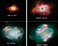 Washington DC (SPX) Sep 13, 2007 The colorful, intricate shapes in these NASA Hubble Space Telescope images reveal how the glowing gas ejected by dying Sun-like stars evolves dramatically over time. These gaseous clouds, called planetary nebulae, are created when stars in the last stages of life cast off their outer layers of material into space. Ultraviolet light from the remnant star makes the material glow. Planetary nebulae last for only 10,000 years, a fleeting episode in the 10-billion-year lifespan of Sun-like stars. The name planetary nebula has nothing to do with planets. They got their name because their round shapes resembled planets when seen through the small telescopes of the eighteenth century. The Hubble images show the evolution of planetary nebulae, revealing how they expand in size and change temperature over time. A young planetary nebula, such as He 2-47, at top, left, for example, is small and is dominated by relatively cool, glowing nitrogen gas. In the Hubble images, the red, green, and blue colors represent light emitted by nitrogen, hydrogen, and oxygen, respectively. Over thousands of years, the clouds of gas expand away and the nebulae become larger. Energetic ultraviolet light from the star penetrates more deeply into the gas, causing the hydrogen and oxygen to glow more prominently, as seen near the center of NGC 5315. In the older nebulae, such as IC 4593, at bottom, left, and NGC 5307, at bottom, right, hydrogen and oxygen appear more extended in these areas, and red knots of nitrogen are still visible. These four nebulae all lie in our Milky Way Galaxy. Their distances from Earth are all roughly the same, about 7,000 light-years. The snapshots were taken with Hubble's Wide Field Planetary Camera 2 in February 2007. Like snowflakes, planetary nebulae show a wide variety of shapes, indicative of the complex processes that occur at the end of stellar life. He 2-47, at top, left, is dubbed the "starfish" because of its shape. The six lobes of gas and dust, which resemble the legs of a starfish, suggest that He 2-47 puffed off material at least three times in three different directions. Each time, the star fired off a narrow pair of opposite jets of gas. He 2-47 is in the southern constellation Carina. NGC 5315, the chaotic-looking nebula at top, right, reveals an x-shaped structure. This shape suggests that the star ejected material in two different outbursts in two distinct directions. Each outburst unleashed a pair of diametrically opposed outflows. NGC 5315 lies in the southern constellation Circinus. IC 4593, at bottom, left, is in the northern constellation Hercules. NGC 5307, at bottom, right, displays a spiral pattern, which may have been caused by the dying star wobbling as it expelled jets of gas in different directions. NGC 5307 resides in the southern constellation Centaurus. Related Links Hubble Stellar Chemistry, The Universe And All Within It
