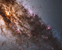 Resembling looming rain clouds on a stormy day, dark lanes of dust crisscross the giant elliptical galaxy Centaurus A. Hubble's panchromatic vision, stretching from ultraviolet through near-infrared wavelengths, reveals the vibrant glow of young, blue star clusters and a glimpse into regions normally obscured by the dust. The warped shape of Centaurus A's disk of gas and dust is evid ... read more