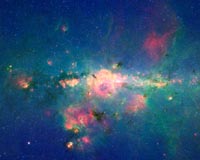 Stars Gather In Downtown Milky WayLos Angeles CA (SPX) Mar 21, 2011 The region around the center of our Milky Way galaxy glows colorfully in this new version of an image taken by NASA's Spitzer Space Telescope. The data were previously released as part of a long, 120-degree view of the plane our galaxy. Now, data from the very center of that picture are being presented at a different contrast to better highlight this jam-packed region. In visible-light pic ... read more |