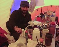 Science in kitchen tent: Alfonso Davila, testing his samples to determine what types of salts are present, adds some science to the dining table mix! Credit: Jen Heldmann