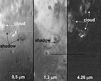 Paris, France (SPX) Jan 17, 2008 Until now, Mars has generally been regarded as a desert world, where a visiting astronaut would be surprised to see clouds scudding across the orange sky. However, new results show that the arid planet possesses high-level clouds that are sufficiently dense to cast a shadow on the surface. The results were obtained by the OMEGA Visible and Infrared Mineralogical Mapping Spectrometer instrument on board ESA's Mars Express. Mars is not entirely a haven for Sun worshippers. Clouds of water ice particles do occur, for example on the flanks of the giant Martian volcanoes. There have also been hints of much higher, wispy clouds made up of carbon dioxide (CO2) ice crystals. This is not too surprising, since the thin Martian atmosphere is mostly made of carbon dioxide, and temperatures on the fourth planet from the Sun often plunge well below the 'freezing point' of carbon dioxide. Now, a team of French scientists has shown that such clouds of dry ice do, indeed, exist. Furthermore, they are sometimes so large and dense that they throw quite dark shadows on the dusty surface. "This is the first time that carbon dioxide ice clouds on Mars have been imaged and identified from above," said Franck Montmessin of the Service d'Aeronomie, University of Versailles (UVSQ), lead author of the paper in the Journal of Geophysical Research. "This is important because the images tell us not only about their shape, but also their size and density. "Previously, we had to rely on indirect information - for example, from the SPICAM instrument on board Mars Express - to find out what the clouds are made of. However, it is very difficult to separate the signals coming from the clouds, the atmosphere and the surface." Data from the SPICAM Ultraviolet and Infrared Atmospheric Spectrometer indicated that any high altitude clouds are not very thick and made up of much smaller particles, but the CO2 clouds detected by OMEGA are very different. Not only are they surprisingly high - more than 80 km above the surface - but they can be several hundred kilometres across. They are also much thicker than expected. Instead of looking like the wispy ice clouds seen on Earth, they resemble tall convectional clouds that grow as the result of rising columns of warm air. Even more surprising is the fact that the CO2 ice clouds are made of quite large particles - more than a micron (one thousandth of a millimetre) across - and they are sufficiently dense to noticeably dim the Sun. Normally, particles of this size would not be expected to form in the upper atmosphere or to stay aloft for very long before falling back towards the surface. "The clouds imaged by OMEGA can reduce the Sun's apparent brightness by up to 40 per cent," said Montmessin. "This means that they cast quite a dense shadow and this has a noticeable effect on the local ground temperature. Temperatures in the shadow can be up to 10C cooler than their surroundings, and this in turn modifies the local weather, particularly the winds." Since the CO2 clouds are mostly seen in equatorial regions, the OMEGA team believes that the unexpected shape of the clouds and large size of their ice crystals can be explained by the extreme variations in daily temperature that occur near the equator. "The cold temperatures at night and relatively high day-time temperatures cause large diurnal waves in the atmosphere," explained Montmessin. "This means there is a potential for large-scale convection, particularly as the morning Sun warms the ground." Bubbles of warm gas rise above the surface and when they reach high levels they become cold enough for CO2 to condense. This process releases latent heat, which causes the gas and the ice particles to rise even further. What are the particles around which the CO2 ice condenses? On Earth, cloud droplets form around tiny nuclei - often particles of dust or salt. On Mars, the answer remains uncertain. One possibility is that Martian dust is carried to high altitudes. Another potential source of condensation nuclei is particles left behind by micrometeorites entering the upper atmosphere. Or the nuclei may simply be tiny crystals of water ice carried aloft on the thermal updraughts. "This discovery is important when we come to consider the past climate of Mars," said Montmessin. "The planet seems to have been much warmer billions of years ago, and one theory suggests that Mars was then blanketed with CO2 clouds. We can use our studies of present-day conditions to understand the role that such high level clouds could have played in the global warming of Mars." Related Links Looking at Mars Mars News and Information at MarsDaily.com Lunar Dreams and more