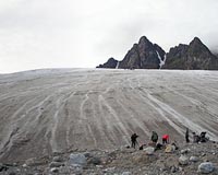 One of the field trips during AMASE 2009. While the group on the top is taking microbiological samples, Fernando and Antonio are obtaining measurements of glacier ice using the remote Raman system. Image credit: Juan Diego Rodriguez-Blanco / AMASE