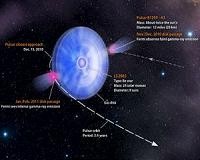 In December 2010, a pair of mismatched stars in the southern constellation Crux whisked past each other at a distance closer than Venus orbits the sun. The system possesses a so-far unique blend of a hot and massive star with a compact fast-spinning pulsar. The pair's closest encounters occur every 3.4 years and each is marked by a sharp increase in gamma rays, the most extreme form of light. ... read more