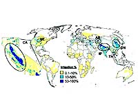 Livermore CA (SPX) Aug 16, 2007 Expansion of irrigation has masked greenhouse warming in California's Central Valley, but irrigation may not make much of a difference in the future, according to a new study in the Aug. 13 edition of the Proceedings of the National Academy of Sciences. Irrigation's influence on climate is often overlooked when studying the human effect on regional climate change. Yet, irrigation has expanded rapidly in many parts of the world and understanding its influence helps to explain historical trends and to improve climate projections in those regions. "Globally we derive 40 percent of our food from irrigated regions, so we'd like to be able to model future climate changes in these regions," said Celine Bonfils, lead author of the study from Lawrence Livermore National Laboratory and U.C. Merced. Based on observations of temperature and irrigation trends throughout the state, the authors demonstrated a clear irrigation-induced cooling in agricultural areas, and showed that this effect has recently slowed down. "This is not a model result, but something very clearly evident in the data. We also looked at other major irrigated regions in the world, and saw a very similar pattern" Bonfils said. The team, which included Bonfils and David Lobell at Livermore Lab, first studied the net impact of widespread irrigation on local and regional climate in California, the top irrigating state in the United States (3.3 million hectares). In highly irrigated regions of the San Joaquin Valley, daytime temperatures relative to low irrigated areas have cooled by 1.8 degrees - 3.2 degrees C since the introduction of irrigation practice in 1887. "In comparison, there was no clear effect of irrigation on temperatures over the 1980-2000 period when there was no net growth of irrigation," Lobell said. Irrigation cools the surface of the earth by increasing the amount of energy used to evaporate water rather than heat the land. The more irrigated the land, the more intense the effect. "It was quite surprising how well we could distinguish a cooling trend that incrementally increases with the amount of irrigation," Bonfils said. This study also shows that the rapid summer nighttime warming, well observed in Central California since 1915, cannot be explained by irrigation expansion, as outside research has implied. "Our results show that the expansion of irrigation has almost no effect on minimum temperatures and that irrigation cannot be blamed for this rapid warming," Bonfils said. "An increase in greenhouse gases and urbanization would best explain this trend, which exceeds what is possible from natural climate variability alone," Lobell said. In other areas of the world where irrigation development has been rapid, including Thailand, the Aral Sea Basin and Nebraska (the second most irrigated state in the United States), the research team found the same cooling effect in summer daytime maximum temperatures. In India, Pakistan and Eastern China, the temperature change due to irrigation is a little less clear because of the presence of aerosols in the atmosphere that also contribute to the observed cooling by reflecting or absorbing sunlight. In California, irrigation expansion is likely to end because of urbanization and water demand increase. In the United States, irrigation has for the first time decreased by 2 percent from 1998-2003 and growth in irrigation has already slowed down in many parts of the world. "Throughout the major irrigated regions of the world, the cooling influence of irrigation on daytime maximum temperatures will be much smaller in the next 50 years than in the past century, and will likely not continue to curb the effects of greenhouse warming anymore," Bonfils said. Founded in 1952, Lawrence Livermore National Laboratory is a national security laboratory, with a mission to ensure national security and apply science and technology to the important issues of our time. Lawrence Livermore National Laboratory is managed by the University of California for the U.S. Department of Energy's National Nuclear Security Administration. Related Links Lawrence Livermore National Laboratory Water News - Science, Technology and Politics
