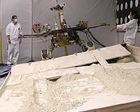 Pasadena CA (JPL) Jul 27, 2009 Mars rover team members have begun a new phase of testing at JPL - using longer-duration experiments - in their preparations for driving Spirit again on Mars. They have completed assessments of individual maneuvers, using the test rover in a box of sloped, soft soil that simulates conditions at the patch of Martian ground called "Troy," where Spirit's wheels have dug themselves hub-deep. Tests have began last week that are using combinations of the individual maneuvers and longer-duration drives. These tests will evaluate a full escape strategy for Spirit. With the test rover temporarily removed from the box on Friday, July 24, the rover team members renewed the test setup. They tamped the soil in the uphill half of the box with more pressure than the soil on the downhill side. This was done to offer a closer simulation to the conditions at Troy, where Spirit's wheels have not churned up the soil as much on the uphill side. At Troy, meanwhile, Spirit is continuing to use all of its tools to examine the environment around it.