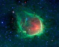 This glowing emerald nebula seen by NASA's Spitzer Space Telescope is reminiscent of the glowing ring wielded by the superhero Green Lantern. In the comic books, the diminutive Guardians of the Planet "Oa" forged his power ring, but astronomers believe rings like this are actually sculpted by the powerful light of giant "O" stars. O stars are the most massive type of star known to exist. N ... read more