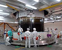 Paris, France (ESA) Feb 28, 2008 Jules Verne, the first Automated Transfer Vehicle, has been encapsulated in its huge fairing on top of the Ariane 5 launcher. With a total mass of about 19 360 kg, Jules Verne is the largest payload ever launched by Ariane 5. This historical mission with the first European space supplier for the ISS is scheduled for a night time launch on 8 March at 04.23 UT. In mid-February, Jules Verne Automated Transfer Vehicle (ATV), having been filled with a total of 6.5 tonnes of four different propellants and 20 kg of oxygen, was transferred in a payload container from the S5 building to the Ariane 5 Final Assembly Building at Europe's Spaceport in Kourou, French Guiana. Since then, Ariane 5 and ATV have been undergoing a complex combined operations plan. The 19.4-tonne Jules Verne mass represents more than twice the heaviest single payload Ariane 5 has ever lifted in the past, including Envisat, ESA's 8-tonne environment satellite. To handle such a heavyweight, the Vehicle Equipment Bay which supports the ATV on top of the launcher, has been structurally redesigned and strengthened. Through the upper level of the Final Assembly Building - the so-called 'chimney' - the cylindrical ATV was installed on top of Ariane 5 and carefully bolted to the launcher interface. "Seeing the fairing encapsulation on Jules Verne was on the one hand a very exciting step in the final countdown to launch. On the other hand it was rather sad as we all knew we will not see again on Earth our old friend who we have been working with so closely over so many years," said John Ellwood, ESA's ATV Project Manager. During the coming week all connections - electrical, pyrotechnical and fluid interfaces - will be checked on ATV and Ariane 5. The entire spacecraft will be activated to check the spacecraft's 'health', and to charge the batteries once again. The entire cylindrical vehicle with its numerous protuberances, thrusters and antennas has been carefully covered with a white insulating foil layer (MLI / Multi Layer Insulator). This blanket thermally protects the ATV from the enormous temperature changes in orbit. Like a huge white thermal flask, the foil layer also keeps the interior of the vehicle at a constant temperature. The exterior of the spacecraft has been thoroughly vacuum cleaned, removing every last small part or flake which could float around the ATV once the European vessel is in orbit. About 250 small 'remove before flight' flags and red covers were taken off one by one as each associated action was completed; including the protective covers on Jules Verne's rendezvous optical sensors. On 25 February, after extensive checks and visual inspection of the ATV, the largest Ariane 5 fairing - a version measuring 17 metres in height and weighing 2500 kg - was successfully installed over the ATV. Besides the large Arianespace team in charge of the launcher, some 50 people from Astrium and its subcontractors (Thales Alenia Space, RSC Energia) and ESA have supported the integration of ATV over the last few weeks. "The campaign has been very successful with no major issues and has kept perfectly to a tight schedule. Most of our teams have worked on two 8-hour shifts, six days a week. Some of the engineers and technicians have worked on this programme for 6 to 10 years. It was an emotional moment when the ATV was covered with its fairing. The next time anyone will see Jules Verne ATV, it will be in orbit for rendezvous in the first days of April", said Nicolas Chamussy, ATV Programme Manager for EADS Astrium. One week before launch, all the launch teams and different control centres around the world will simulate a full 10-hour countdown to lift-off with the real Ariane 5 and ATV vehicle. After the launch onboard Ariane 5, the ATV's high-precision navigation system will guide the spacecraft to the International Space Station, with docking planned in early April. Related Links Automated Transfer Vehicle Space Tourism, Space Transport and Space Exploration News