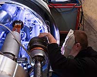 Geneva, Switzerland (SPX) Nov 08, 2007 At a brief ceremony deep under the French countryside, CERN1 Director General Robert Aymar sealed the last interconnect in the world's largest cryogenic system, the Large Hadron Collider (LHC). This is the latest milestone in commissioning the LHC, the world's most powerful particle accelerator. The LHC's cryogenic system has the task of cooling some 36 800 tonnes of material to a temperature of just 1.9 degrees above absolute zero (-271.3C), colder than outer space. To do this, over 10 000 tonnes of liquid nitrogen and 130 tonnes of liquid helium will be deployed through a cryogenic system including over 40 000 leak-tight welds. Today's ceremony marks the end of a two year programme of work to connect all the main dipole and quadrupole magnets in the LHC. This complex task included both electrical and fluid connections. "This is a huge accomplishment," said Lyn Evans, LHC project leader. "Now that it is done, we can concentrate on getting the machine cold and ready for physics." The LHC is a circular machine, 27 kilometres around and divided into eight sectors, each of which can be cooled down to its operating temperature of 1.9 degrees above absolute zero and powered-up individually. One sector was cooled down, powered and warmed up in the first half of 2007. This was an important learning process, allowing subsequent sectors to be tested more quickly. "Over the coming months, we'll be cooling down the remaining sectors," said Evans. "Five sectors will be cooling by the end of 2007, with the remaining three joining them early next year." If all goes well, the first beams could be injected into the LHC in May 2008, and circulating beams established by June or July. With a project of this scale and complexity, however, the transition from construction to operation is a lengthy process. "There is no big red button, and there are inevitably hurdles to be overcome as we bring the LHC into operation," said Aymar, "Every part of the system has to be brought on stream carefully, with each sub-system and component tested and repaired if necessary." "There have been no show-stoppers so far," added Evans. "For a machine of this complexity, things are going remarkably smoothly and we're all looking forward to doing physics with the LHC next summer. If for any reason we have to warm up a sector, though," he cautioned, "we'll be looking at the end of summer rather than the beginning." Related Links Understanding Time and Space