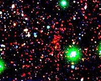 An example of one of the most massive clusters found in the SpARCS survey is shown in the accompanying image. Seen when the universe was a mere 4.8 billion years old, this is also one of the most distant clusters ever discovered. Many similar-color red cluster galaxies can be seen in the image (the green blobs are stars in our own galaxy, The Milky Way).