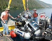 Engineers from Nuytco lower PLRP Co-PI Greg Slater into the waters of Pavilion Lake in one of the DeepWorker mini-subs. Credit: Henry Bortman