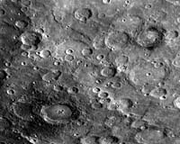 As MESSENGER flew by Mercury on January 14, 2008, the Narrow Angle Camera (NAC) of the Mercury Dual Imaging System (MDIS) captured this view. Two of the larger craters in this image appear to have darkened crater rims and partial "halos" of dark material immediately surrounding the craters.