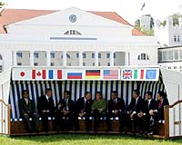 G8 Heads of State pose in a giant beach chair for a family picture in front of the Kurhaus building in Heiligendamm, northeastern Germany, during their first working session: (L-R) Japanese Prime Minister Shinzo Abe, Canadian Prime Minister Stephen Harper, French President Nicolas Sarkozy, Russian President Vladimir Putin, German Chancellor Angela Merkel, US President George W. Bush, British Prime Minister Tony Blair, Italian Prime minister Romano Prodi and European Commission President Jose Manuel Barroso. German Chancellor Angela Merkel is hosting the meeting as the chairman of the G8, which also includes Britain, Canada, France, Italy, Japan, Russia and the United States. Photo courtesy AFP.