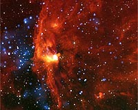 The Spitzer data show the location of the embedded star cluster, which appears as the bright knot of red and orange just to the left of the center of the image. Some stars from a larger cluster, known as NGC 6193, are also visible on the left side of the image.