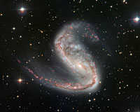 The Meathook Galaxy, or NGC 2442, has a dramatically lopsided shape. One spiral arm is tightly folded in on itself and host to a recent supernova, while the other, dotted with recent star formation, extends far out from the nucleus. The NASA/ESA Hubble Space Telescope and the MPG/ESO 2.2-meter telescope have captured two contrasting views of this asymmetric spiral galaxy. The Meathoo ... read more