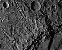 It shows a region 300 miles across including craters less than a mile wide. The large, shadow-filled, double ringed crater to the upper right was glimpsed by Mariner 10 more than three decades ago and named Vivaldi, after the Italian composer.