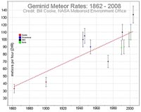 The 2009 Geminid Meteor ShowerHuntsville AL (SPX) Dec 09, 2009 Make hot cocoa. Bundle up. Tell your friends. The best meteor shower of 2009 is about to fall over North America on a long, cold December night. "It's the Geminid meteor shower," says Bill Cooke of NASA's Meteoroid Environment Office. "and it will peak on Dec. 13th and 14th under ideal viewing conditions." A new Moon will keep skies dark for a display that Cooke and others say could ... read more |