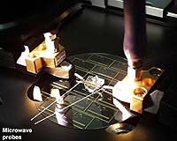 Washington DC (SPX) Nov 12, 2007 Researchers at the National Institute of Standards of Technology (NIST) and George Mason University have demonstrated what is probably the world's smallest microwave oven, a tiny mechanism that can heat a pinhead-sized drop of liquid inside a container slightly shorter than an ant and half as wide as a single hair. The micro microwave is intended for lab-on-a-chip devices that perform rapid, complex chemical analyses on tiny samples. In a paper in the November 2007 Journal of Micromechanics and Microengineering*, the research team led by NIST engineer Michael Gaitan describes for the first time how a tiny dielectric microwave heater can be successfully integrated with a microfluidic channel to control selectively and precisely the temperature of fluid volumes ranging from a few microliters (millionth of a liter) to sub-nanoliters (less than a billionth of a liter). Sample heating is an essential step in a wide range of analytic techniques that could be built into microfluidic devices, including the high-efficiency polymerase chain reaction (PCR) process that rapidly amplifies tiny samples of DNA for forensic work, and and methods to break cells open to release their contents for study. The team embedded a thin-film microwave transmission line between a glass substrate and a polymer block to create its micro microwave oven. A trapezoidal-shaped cut in the polymer block only 7 micrometers across at its narrowest-the diameter of a red blood cell-and nearly 4 millimeters long (approximately the length of an ant) serves as the chamber for the fluid to be heated. Based on classical theory of how microwave energy is absorbed by fluids, the research team developed a model to explain how their minature oven would work. They predicted that electromagnetic fields localized in the gap would directly heat the fluid in a selected portion of the micro channel while leaving the surrounding area unaffected. Measurements of the microwaves produced by the system and their effect on the fluid temperature in the micro channel validated the model by showing that the increase in temperature of the fluid was predominantly due to the absorbed microwave power. Once the new technology is more refined, the researchers hope to use it to design a microfluidic microwave heater that can cycle temperatures rapidly and efficiently for a host of applications. Related Links National Institute of Standards and Technology (NIST) Computer Chip Architecture, Technology and Manufacture Nano Technology News From SpaceMart.com