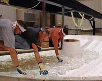 Casting team members at the Steward Observatory Mirror Lab loading 22,500 pounds of E6 Ohara borosilicate glass into the 6.5-meter honeycomb mold for the San Pedro M�rtir Telescope mirror. (Ray Bertram, Steward Observatory, University of Arizona)