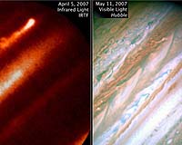 Tucson AZ (SPX) Jan 29, 2008A University of Arizona scientist, observing Jupiter with the Hubble Space Telescope last May, took some of the best images of two unusual giant storms that erupted from the planet last spring. Erich Karkoschka of the UA's Lunar and Planetary Laboratory is co-author on a scientific paper being published about Jupiter's giant storms in the Jan. 24 issue of the journal Nature. |