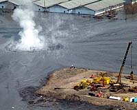 Experts dispute cause of mud volcanoPorong, Indonesia (UPI) Feb 12, 2009 Scientists and drilling experts say they're in disagreement about whether a gas exploration well triggered a fatal mud volcano in Indonesia. The world's biggest mud volcano killed 13 people and displaced 30,000 more May 29, 2006, in the Porong sub-district of Sidoarjo, East Java. Mud from the volcanic dome destroyed four villages and continues to ooze enough to fill 50 Olympic-size swim ... read more |