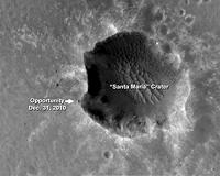 Rover Will Spend Seventh Birthday At Stadium-Size CraterPasadena CA (JPL) Jan 05, 2011 The High Resolution Imaging Science Experiment (HiRISE) camera on NASA's Mars Reconnaissance Orbiter captured a Dec. 31, 2010, view of the Mars Exploration Rover Opportunity on the southwestern rim of a football-field-size crater called "Santa Maria." Opportunity arrived at the western edge of Santa Maria crater in mid-December and will spend about two months investigating rocks there. ... read more |