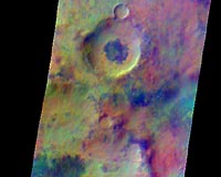 Pastel colors swirl across Mars, revealing differences in the composition and nature of the surface in this false-color infrared image taken on May 22, 2009,by the Thermal Emission Imaging System (THEMIS) camera on NASA's Mars Odyssey orbiter. In the image, dark areas mark exposures of relatively cold ground with abundant bare rock, while warmer basaltic sand covers the light blue-green regions. Reddish areas likely have a higher silica content, due either to a different volcanic composition or to weathering. credit: NASA/JPL/Arizona State University