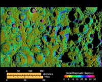 This map shows the steepness of the terrain in the south polar region of the moon. Using a map like this helps determine the assessable areas to human or robotic explorers.