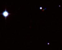 For the stars, these three colours added up to neutral white. In contrast, the WMAP satellite shows up as the string of coloured points - since it is the only object having moved between the times the three images were taken. In addition to WMAP and a number of stars, a faint galaxy is visible as a slightly fuzzy blob at top centre of the picture.