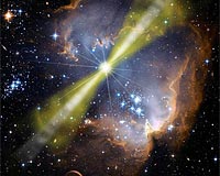 University Park PA (SPX) Sep 11, 2008 Unparalleled data from satellites and observatories around the globe show that the jet from a powerful stellar explosion on 19 March was aimed almost directly at Earth. The event, called a gamma-ray burst, became bright enough for human eyes to see. The burst's extraordinary brightness arose from a jet that shot material directly toward Earth at 99.99995 percent the speed of light. NASA's Swift satellite detected the explosion -- formally called GRB 080319B -- at 2:13 a.m. U.S. Eastern Time that morning and pinpointed its position in the constellation Bootes. The Swift satellite is controlled by Penn State University from its Mission Operations Center at University Park, and Penn State led in the development and assembly of two of the Swift satellite's three telescopes. "Swift was designed to find unusual bursts," says Swift principal investigator Neil Gehrels at NASA's Goddard Space Flight Center. "We really hit the jackpot with this one." In a paper to appear in Thursday's issue of Nature, Judith Racusin, a graduate student at Penn State and the lead author of the paper, and a team of 92 coauthors, report observations across the electromagnetic spectrum that began 30 minutes before the explosion and followed its afterglow for months. The team's observations give astronomers the most detailed portrait of a gamma-ray burst ever made. "At first, I thought something was wrong," Racusin recalls, because both Swift's X-Ray Telescope and its UltraViolet/Optical Telescope indicated they were effectively blinded by the brightness of the blast. "Within minutes, as reports from other observers arrived, it was clear this explosion was an especially extraordinary event." At the same moment Swift saw the burst, the Russian KONUS detector on NASA's Wind satellite also sensed the gamma rays and provided a wide view of their spectral structure. Simultaneously, a robotic wide-field optical camera called "Pi of the Sky" in Chile captured the burst's first visible light. The system is operated by a group of institutions from Poland. Within the next 15 seconds, the burst brightened enough to be visible in a dark sky to human eyes. It briefly crested at magnitude 5.3 on the astronomical brightness scale. Incredibly, the dying star was 7.5 billion light-years away. Telescopes around the world were already studying the afterglow of another burst when GRB 080319B exploded just 10 degrees away. TORTORA, a robotic wide-field optical camera operated in Chile by a Russian-Italian collaboration, also caught the early light. TORTORA's rapid imaging provides the most detailed look yet at visible light associated with a GRB's initial gamma-ray blast. "We've been waiting a long time for this one," says TORTORA senior scientist Grigory Beskin of Russia's Special Astrophysical Observatory. Gamma-ray bursts are the universe's most luminous explosions. Most occur when massive stars run out of nuclear fuel. As a star's core collapses, it creates a black hole or neutron star that, through processes not fully understood, drive powerful gas jets outward. These jets punch through the collapsing star. As the jets shoot into space, they strike gas previously shed by the star and heat it, which generates bright afterglows. The team believes the jet directed toward Earth contained an ultra-fast component just 0.4 of a degree across. This core resided within a slightly less energetic jet about 20 times wider. The broad component is more typical of what Swift sees from other bursts. Perhaps every gamma-ray burst has a narrow jet, but astronomers miss it most of the time. The nearly head-on alignment required to see it occurs by chance only about once a decade. Swift is managed by NASA's Goddard Space Flight Center and is controlled by Penn State. It was built and is being operated in collaboration with Penn State, the Los Alamos National Laboratory, and General Dynamics in the U.S.; the University of Leicester and Mullard Space Sciences Laboratory in the United Kingdom; Brera Observatory and the Italian Space Agency in Italy; plus partners in Germany and Japan. The TORTORA camera is mounted on the Italian REM telescope at the European Southern Observatory in Chile. It was built and is being operated by a collaboration between Italy's Bologna State University and Brera Observatory and Russia's Special Astrophysical Observatory and Institute of Precise Instrumentation. Related Links Penn State Stellar Chemistry, The Universe And All Within It