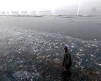 A Kashmiri pedestrian walks on the frozen surface of Dal Lake in Srinagar, 03 January 2008. The Kashmir valley awoke to the coldest day of the season in more than two decades with the minimum temperature dipping to minus 7.5 degrees Celsius. Major parts of Dal Lake and hundreds of other ponds, taps, water motors and drains were frozen. At least 47 people have died because of a biting cold wave sweeping northern India over the last two weeks, media reports said.The northern Uttar Pradesh state was worst hit, with 38 people freezing to death since the start of the chill in the last week of December, the Press Trust of India reported. New Delhi recorded the season's lowest temperature of 1.9 degrees Celsius (35.42 degrees Fahrenheit) 02 January. Photo courtesy AFP.