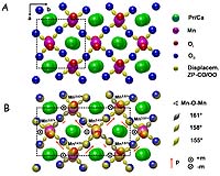 The crystal lattice: A structural model showing disordered (A) and polaron ordered (B) states during application of electric stimulus. The models reveal details of the experimental results including atomic position, lattice displacement, electron polarization (p), and magnetic spin direction (m).