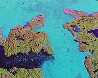 This satellite image, colored for emphasis and taken in 2001, shows the ice sheet margins where land (pink areas) has become exposed and lakes were formed (bright blue). The large bluish-green area is the glacier.