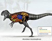 Mendoza, Argentina (SPX) Oct 01, 2008 The remains of a new 10-meter-long predatory dinosaur discovered along the banks of Argentina's Rio Colorado is helping to unravel how birds evolved their unusual breathing system. Paleontologists led by the University of Chicago's Paul Sereno, a National Geographic Explorer-in-Residence, will publish their discovery in the online journal Public Library of Science ONE. Joining Sereno to announce the discovery at a news conference in Mendoza, Argentina, today were Ricardo Martinez and Oscar Alcober, both of the Universidad Nacional de San Juan, Argentina. The discovery of this dinosaur builds on decades of paleontological research indicating that birds evolved from dinosaurs. "Among land animals, birds have a unique way of breathing. The lungs actually don't expand," Sereno said. Instead, birds have developed a system of bellows, or air sacs, which help pump air through the lungs. It's the reason birds can fly higher and faster than bats, which, like all mammals, expand their lungs in a less efficient breathing process. Discovered by Sereno and his colleagues in 1996, the new dinosaur is named Aerosteon riocoloradensis ("air bones from the Rio Colorado"). "Aerosteon, found in rocks dating to the Cretaceous period about 85 million years old, represents a lineage surviving in isolation in South America. Its closest cousin in North American, Allosaurus, had gone extinct millions of years earlier and was replaced by tyrannosaurs." Laboratory technicians spent years cleaning and CT-scanning the bones, which were embedded in hard rock, to finally reveal the evidence of air sacs within Aerosteon's body cavity. Previously, paleontologists had found only tantalizing evidence in the backbone, outside the cavity with the lungs. "This dinosaur, unlike any other, provides more direct evidence of the bellows involved in bird breathing," Martinez said. Its bones have telltale pockets and a sponge-like texture called "pneumatization," in which air sacs from the lung invade bone. Air-filled bones are the hallmark of the bellows system of breathing in birds. Alcober noted, "Despite its huge body size and lack of a breastbone or birdlike ribcage, this meat-eater had lungs that already functioned quite a bit like a bird's." Aerosteon provided the evidence needed to seal the connection with birds - hollow bones in front and behind the ribcage, such as the wishbone (furcula) and the main hip bone (ilium). Said co-author of the PLoS ONE article Jeffrey Wilson of the University of Michigan, "The ancient history of features like air sacs is full of surprising turns, the explanations for which must account for their presence in a huge predator like Aerosteon as well as in a chicken." Sereno further noted that Aerosteon has air sacs in an unusual place. "They come around the edge of the body and go into belly ribs. It looks like the beast had a system of air tubes under its skin," he said. The team highlighted three explanations for the evolution of air sacs in dinosaurs in their paper: development of a more efficient lung; reduction of upper body mass in tipsy two-legged runners; and release of excess body heat. Sereno is especially intrigued by heat loss, given that Aerosteon was likely a high-energy predator with feathers but without sweat glands as in birds. At approximately 30 feet in length and weighing as much as an elephant, Aerosteon might well have used an air system under the skin to rid itself of unwanted heat. Related Links University of Chicago Darwin Today At TerraDaily.com