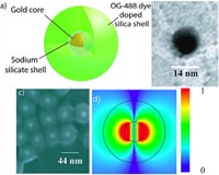 Researchers have created the tiniest laser since its invention nearly 50 years ago. Because the new device, called a "spaser," is the first of its kind to emit visible light, it represents a critical component for possible future technologies based on "nanophotonic" circuitry. The color diagram (a) shows the nanolaser's design: a gold core surrounded by a glasslike shell filled with green dye. Scanning electron microscope images (b and c) show that the gold core and the thickness of the silica shell were about 14 nanometers and 15 nanometers, respectively. A simulation of the SPASER (d) shows the device emitting visible light with a wavelength of 525 nanometers. (Birck Nanotechnology Center, Purdue University)