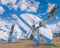 Albuquerque NM (SPX) Jul 16, 2009 Stirling Energy Systems (SES) and Tessera Solar recently unveiled four newly designed solar power collection dishes at Sandia National Laboratories' National Solar Thermal Test Facility (NSTTF). Called SunCatchers, the new dishes have a refined design that will be used in commercial-scale deployments of the units beginning in 2010. "The four new dishes are the next-generation model of the original SunCatcher system. Six first-generation SunCatchers built over the past several years at the NSTTF have been producing up to 150KW [kilowatts] of grid-ready electrical power during the day," says Chuck Andraka, the lead Sandia project engineer. "Every part of the new system has been upgraded to allow for a high rate of production and cost reduction." Sandia's concentrating solar-thermal power (CSP) team has been working closely with SES over the past five years to improve the system design and operation. The modular CSP SunCatcher uses precision mirrors attached to a parabolic dish to focus the sun's rays onto a receiver, which transmits the heat to a Stirling engine. The engine is a sealed system filled with hydrogen. As the gas heats and cools, its pressure rises and falls. The change in pressure drives the piston inside the engine, producing mechanical power, which in turn drives a generator and makes electricity. The new SunCatcher is about 5,000 pounds lighter than the original, is round instead of rectangular to allow for more efficient use of steel, has improved optics, and consists of 60 percent fewer engine parts. The revised design also has fewer mirrors - 40 instead of 80. The reflective mirrors are formed into a parabolic shape using stamped sheet metal similar to the hood of a car. The mirrors are made by using automobile manufacturing techniques. The improvements will result in high-volume production, cost reductions, and easier maintenance. Among Sandia's contributions to the new design was development of a tool to determine how well the mirrors work in less than 10 seconds, something that took the earlier design one hour. "The new design of the SunCatcher represents more than a decade of innovative engineering and validation testing, making it ready for commercialization," says Steve Cowman, Stirling Energy Systems CEO. "By utilizing the automotive supply chain to manufacture the SunCatcher, we're leveraging the talents of an industry that has refined high-volume production through an assembly line process. More than 90 percent of the SunCatcher components will be manufactured in North America." In addition to improved manufacturability and easy maintenance, the new SunCatcher minimizes both cost and land use and has numerous environmental advantages, Andraka says. "They have the lowest water use of any thermal electric generating technology, require minimal grading and trenching, require no excavation for foundations, and will not produce greenhouse gas emissions while converting sunlight into electricity," he says. Tessera Solar, the developer and operator of large-scale solar projects using the SunCatcher technology and sister company of SES, is building a 60-unit plant generating 1.5 MW (megawatts) by the end of the year either in Arizona or California. One megawatt powers about 800 homes. The proprietary solar dish technology will then be deployed to develop two of the world's largest solar generating plants in Southern California with San Diego Gas and Electric in the Imperial Valley and Southern California Edison in the Mojave Desert, in addition to the recently announced project with CPS Energy in West Texas. The projects are expected to produce 1,000 MW by the end of 2012. Last year one of the original SunCatchers set a new solar-to-grid system conversion efficiency record by achieving a 31.25 percent net efficiency rate, toppling the old 1984 record of 29.4. Share This Article With Planet Earth
