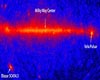 Fermi's first all-sky image shows gas and dust in the plane of the milky way glowing in gamma rays as well as the Crab Nebula, Vela and Geminga pulsars shining brightly.