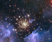 Like a July 4 fireworks display a young, glittering collection of stars looks like an aerial burst. The cluster is surrounded by clouds of interstellar gas and dust - the raw material for new star formation. The nebula, located 20,000 light-years away in the constellation Carina, contains a central cluster of huge, hot stars, called NGC 3603. This environment is not as peaceful as it looks ... read more