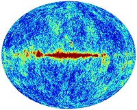 In 1992, the COBE team announced that they had mapped the primordial hot and cold spots in the cosmic microwave background radiation. These spots are related to the gravitational field in the early universe, only instants after the Big Bang, and are the seeds for the giant clusters of galaxies that stretch hundreds of millions of light years across the universe.