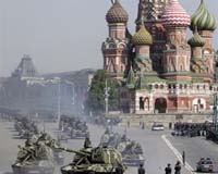 Russian tanks leave the Red square during the rehearsal general for the Victory Day military parade in Moscow on May 5, 2008. Russian military tanks, fighters, jets and ballistic missiles will take part in the May 9 Victory Day parade at Red Square for the first time since the Soviet time. Photo courtesy AFP.